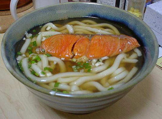 ふと見ると、冷蔵庫の中には「うどん」と残り物の「鮭の塩焼き」・・・
