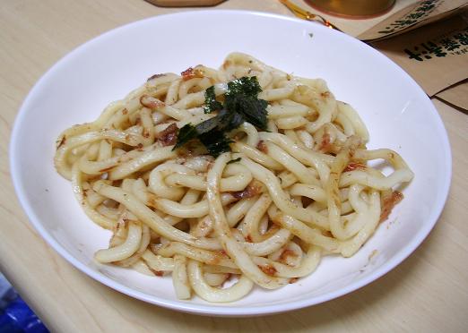 1:まず、うどんを油を引いて過熱してあるフライパンに載せる